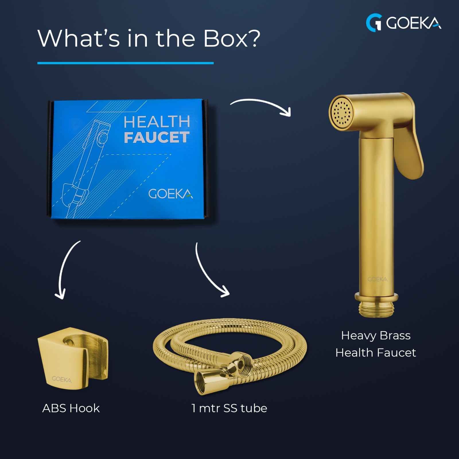The GOEKA Sleek Brass Health Faucet delivers a premium experience for modern bathrooms. This luxury health faucet set includes a sleek brass faucet, a 1-meter flexible hose, and a matching brass hook. Together, they create a complete and refined bathroom solution.